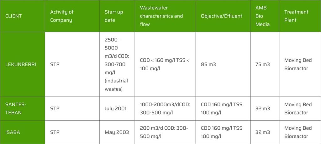 ISABA | STP | May 2003 | 200 m3/d COD: 300-500 mg/l | COD 160 mg/l TSS 100 mg/l | 32 m3 | Moving Bed Bioreactor |