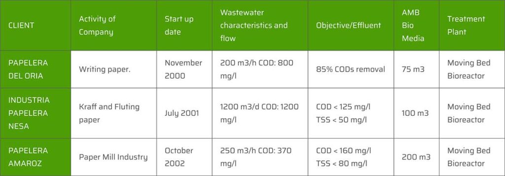 PAPELERA DEL ORIA | Writing paper. | November 2000 | 200 m3/h COD: 800 mg/l | 85% CODs removal | 75 m3 | Moving Bed Bioreactor |