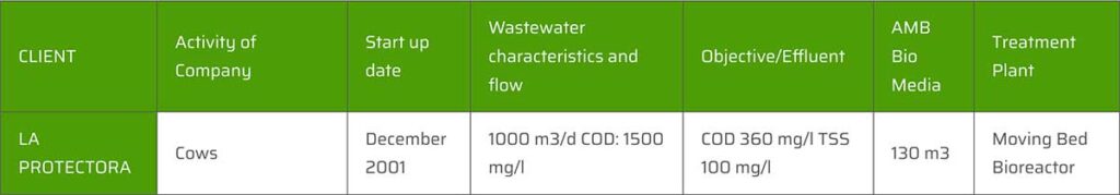 LA PROTECTORA | Cows | December 2001 | 1000 m3/d COD: 1500 mg/l | COD 360 mg/l TSS 100 mg/l | 130 m3 | Moving Bed Bioreactor |