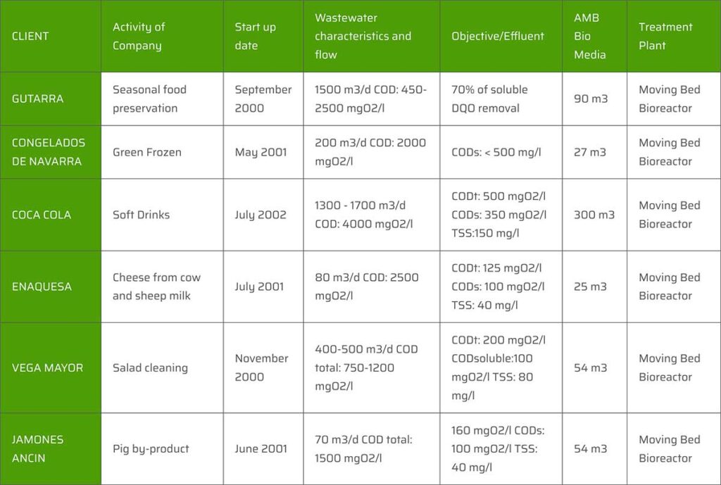 CLIENT | Activity of Company | Start up date | Wastewater characteristics and flow | Objective/Effluent | AMB Bio Media | Treatment Plant |