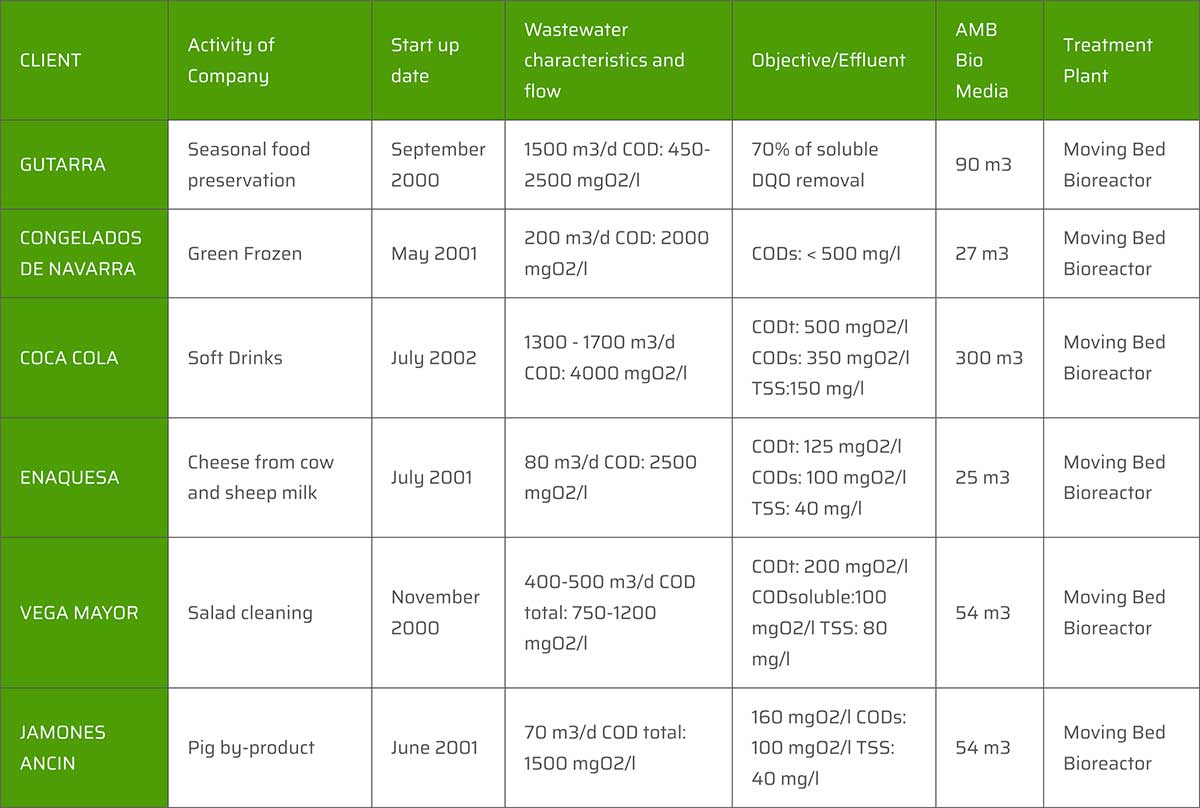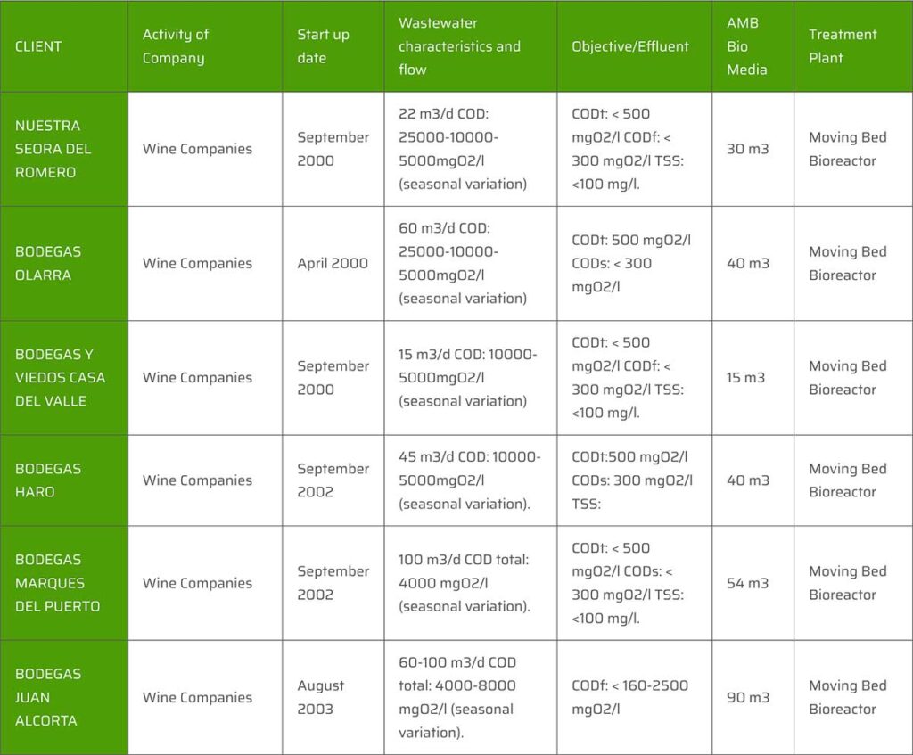 BODEGAS OLARRA | Wine Companies | April 2000 | 60 m3/d COD: 25000-10000-5000mgO2/l (seasonal variation) | CODt: 500 mgO2/l CODs: < 300 mgO2/l | 40 m3 | Moving Bed Bioreactor |